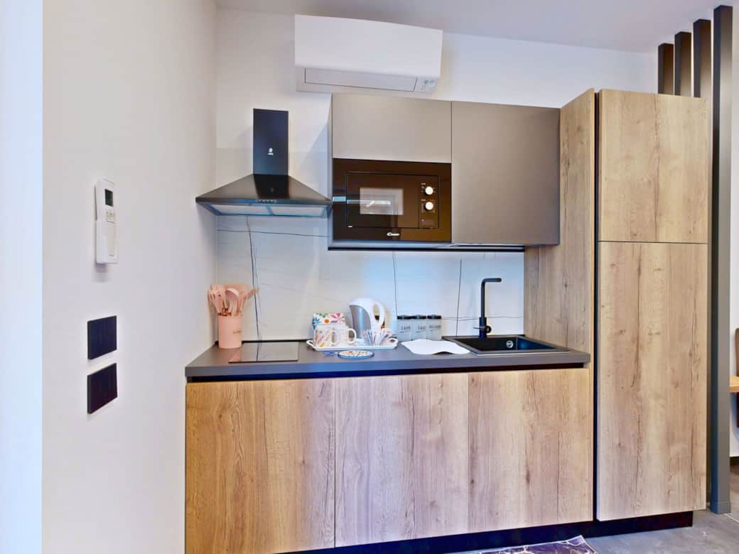 Cooking utensils, Kitchen stove, Kitchenette, Microwave, Oven, Refrigerator